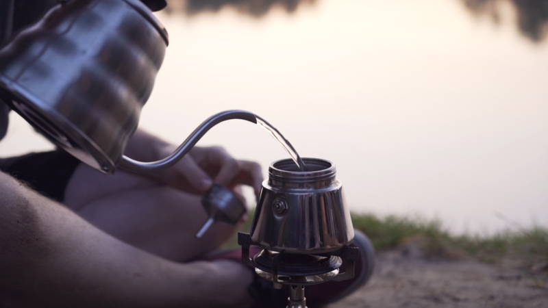 Der Espressokocher aus Edelstahl passt auf jeden Campingkocher. Er ist nicht der leichteste Zubereiter im Test, überzeugt dafür durch seine unkomplizierte Handhabung. Du brauchst nur noch guten Kaffee und heißes Wasser.