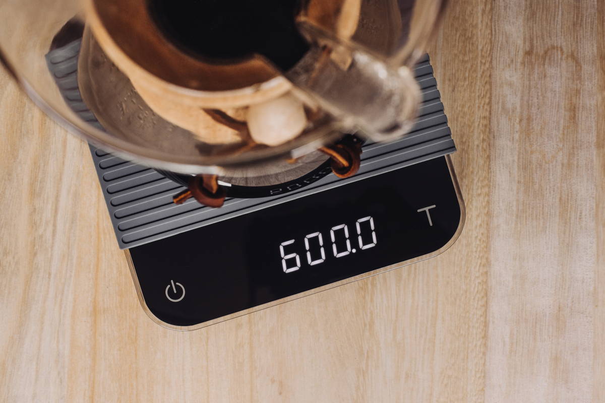 Leider stehen im Großteil der mitgelieferten Anleitungen von Kaffeezubereitern Dosierungsangaben wie „zwei gestrichene Löffel pro Tasse”. Einigen Zubereitern werden auch Portionslöffel für die Dosierung beigelegt. Bei der Zubereitung von richtig gutem Kaffee fallen Mengenangaben dieser Art zu ungenau aus. Daher raten wir, den Kaffee mit Hilfe einer Kaffeewaage zuzubereiten. Sie ist ein einfaches und praktisches Tool, das dir hilft, eine konstante Kaffeequalität zu erzielen – und misst neben den Gramm auch noch einen weiteren wichtigen Faktor: die Extraktionszeit.