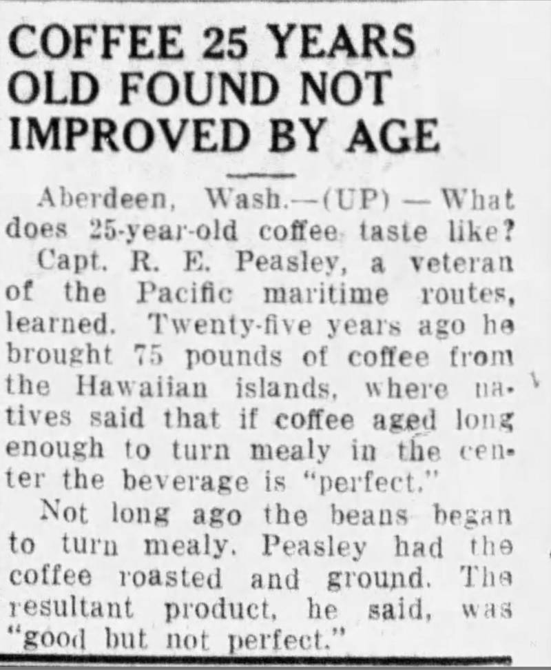Aberdeen, Wash. – (UP) – Wie schmeckt 25 Jahre alter Kaffee? Capt. R. E. Peasley, ein Veteran der pazifischen Maritim-Routen, hat es erfahren. Vor 25 Jahren hat er 75 Pfund Kaffee von den hawaiianischen Inseln gekauft, wo ihm die Einwohner versichert haben, dass das Getränk “perfekt” ist, wenn der Kaffee lang genug reift, um mehlig zu werden. Vor kurzer Zeit sind die Bohnen mehlig geworden. Peasley hat sie rösten und mahlen lassen. Das Ergebnis, sagte er, war “gut, aber nicht perfekt.”